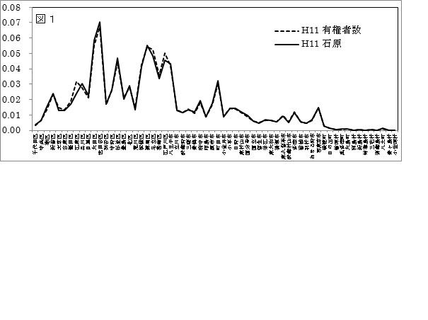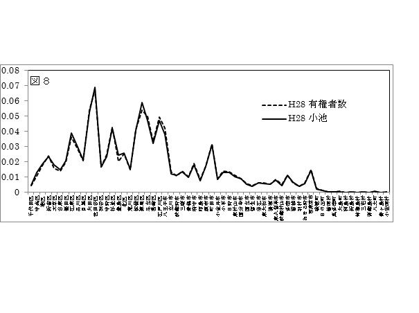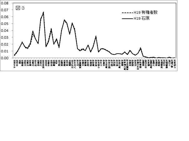 図1-6および図8は、H11(石原)、H15(石原)、H19(石原)、H23(石原)、H24(猪瀬)、H26(舛添)、およびH28(小池)の都知事選での当選者の選挙区得票分布と選挙区有権者分布との比較を示す。人口2万人以下の町村部を除いて、選挙区得票分布と選挙区有権者分布は、「ムサシ」の本格的導入(H26)以前でも良好な一致が見られ、当選候補者に対する都民の投票行動に顕著な地域差がないことが分かる(マスコミの洗脳?)。また、「ムサシ」の導入が開始されたH13以降の当選者の選挙区得票分布と選挙区有権者分布との一致に不自然な変動は見られない。