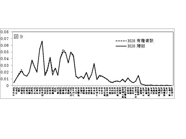 今年(H28)7月に行われた都知事選における2位の増田氏と3位の鳥越氏の選挙区得票分布と選挙区有権者分布との比較を図9と図10に示す。増田氏の選挙区得票分布と選挙区有権者分布との一致は1位の小池氏(図8)と同様に良好であり、不自然な変動は見られない。なお、与党推薦候補である増田氏の落選によって、都知事選での「ムサシ」による得票数の改竄疑惑は否定されると思われる。